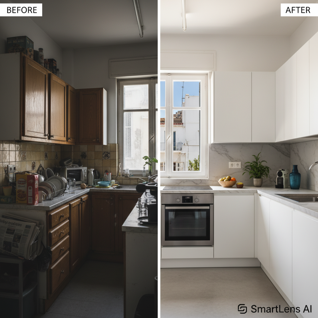 Κουζίνα που δεν πουλάει; Το Before/After που αλλάζει τα πάντα Μια beachfront property στο Athens Center μπορεί να χάνει κρατήσεις εξαιτίας μίας σκοτεινής, ακατάστατης ή χαμηλής ποιότητας φωτογραφίας της κουζίνας. Στο πρότυπο before_after_split βλέπουμε το κλασικό πρόβλημα: amateur snapshot από smartphone αριστερά, και professional listing photo δεξιά. Το SmartLens μετατρέπει…