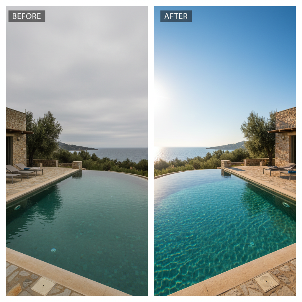 - 3) AI Processing: Σε περίπου 15 δευτερόλεπτα η πλατφόρμα αντικαθιστά τον ουρανό, ρυθμίζει τον κορεσμό και προσαρμόζει τις αντανακλάσεις της πισίνας.