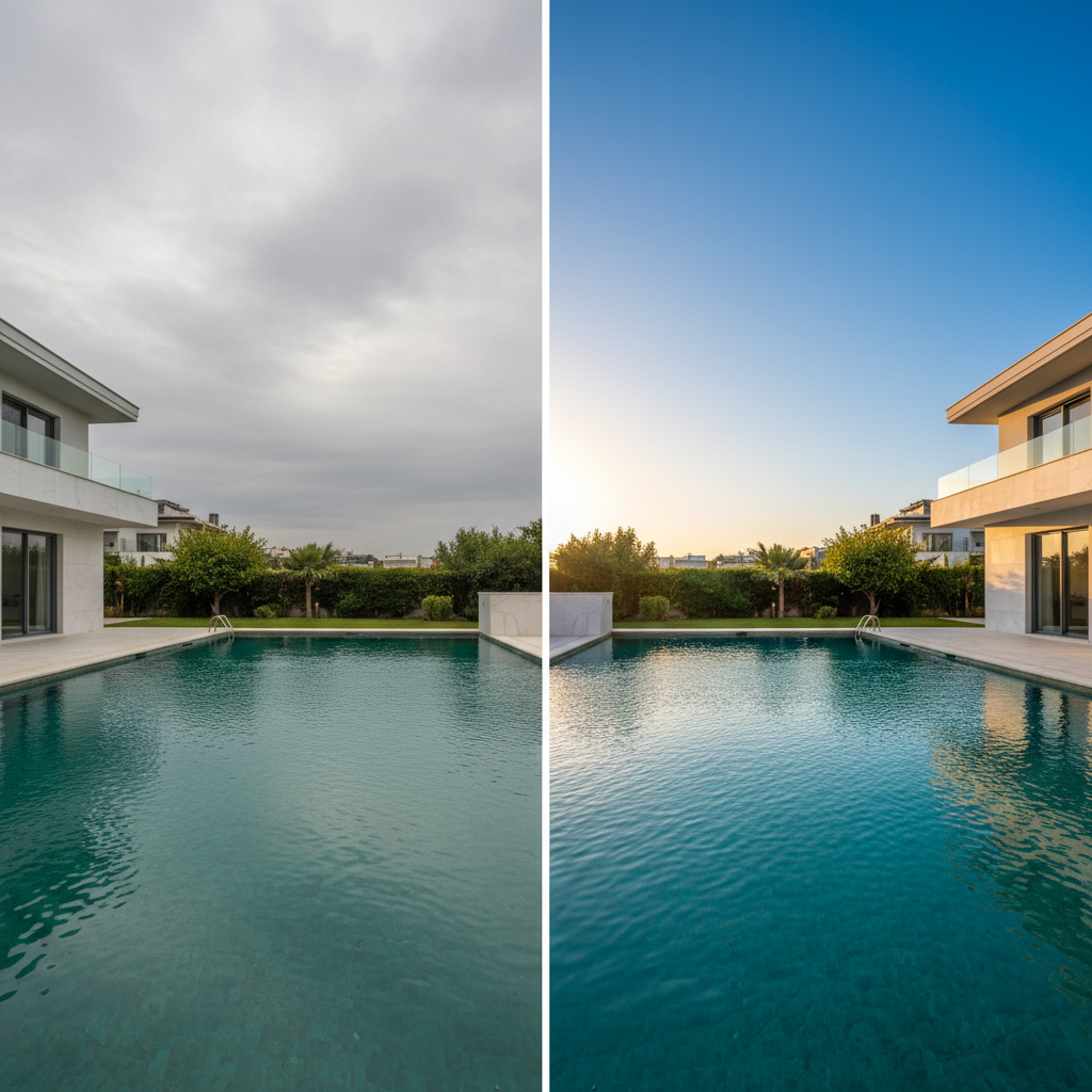 SmartLens AI αναγνωρίζει τον ουρανό στην εικόνα και αντικαθιστά συννεφιασμένο background με ρεαλιστικό μεσογειακό μπλε — προσαρμόζοντας αντανακλάσεις στην πισίνα, φωτισμό και σκιές για φυσικό αποτέλεσμα. Δες το before/after effect σε SmartLens demos και κατανοήστε πόσο μικρή αλλαγή κάνει μεγάλη διαφορά.