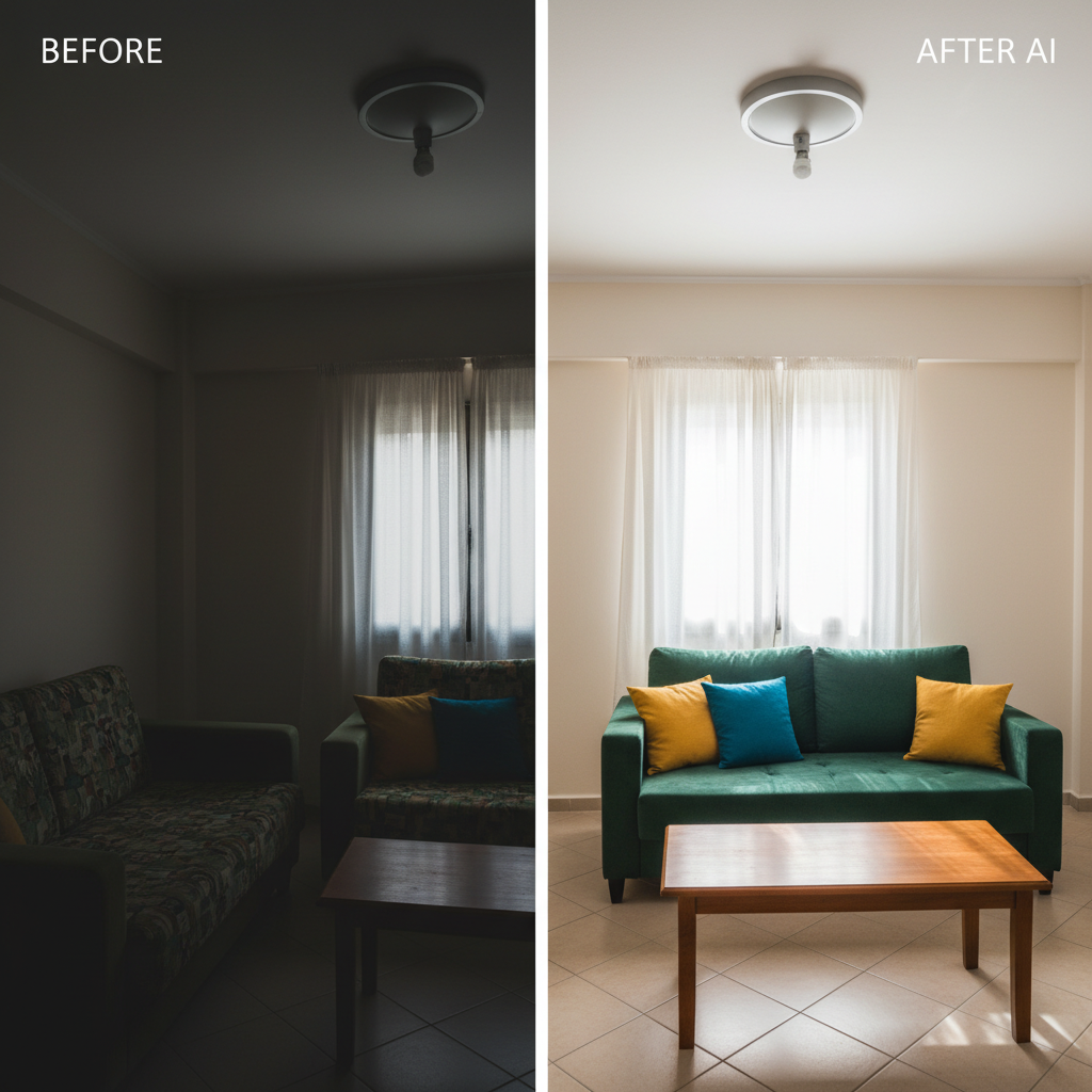 Σκεφτείτε ένα παραδοσιακό villa στη Ζάκυνθο με σκούρα ξύλινα έπιπλα και περιορισμένο φυσικό φως. Η αρχική φωτογραφία δείχνει ένα μικρό, μουντό σαλόνι. Η επεξεργασία AI αποκαθιστά φυσικό φωτισμό, ανοίγει τις σκιές και ενισχύει τα θερμά χρώματα, δημιουργώντας μια ατμόσφαιρα ιδανική για οικογένειες ή ζευγάρια. Το πριν/μετά split αυξάνει την αξιοπιστία του listing και δείχνει επαγγελματισμό στον επισκέπτη.
