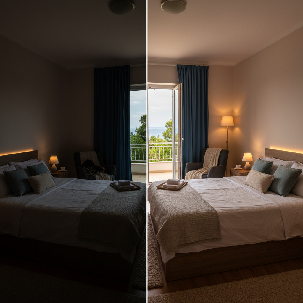 Σε ένα island villa στο Κέρκυρα, το κύριο υπνοδωμάτιο είχε υπέροχη θέα στη θάλασσα αλλά φωτογραφιζόταν πάντα αδύναμο φωτιστικά. Με το before/after split “Dark to Cozy – Bedroom Lighting”, αναβάθμισαμε τις εικόνες: οι σκιές φωτίστηκαν, τα ζεστά tones τονίστηκαν και το κρεβάτι απέκτησε αίσθηση πολυτέλειας. Το listing είδε +40% bookings μέσα σε 6 εβδομάδες μετά το upload των νέων φωτογραφιών.