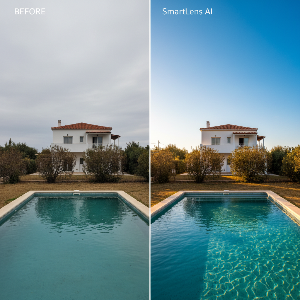 Γκρίζος Ουρανός Σκοτώνει το Outdoor Appeal Μια εξωτερική φωτογραφία με συννεφιά μπορεί να μειώσει σημαντικά το ενδιαφέρον για ένα island villa στο Santorini. Οι επισκέπτες αποφασίζουν σε δευτερόλεπτα —και ένα γκρίζο ουρανό πάνω από την πισίνα ή το υπαίθριο σαλόνι δίνει την εντύπωση δυσάρεστου και «μισού διακοπών». Το SmartLens μετατρέπει…