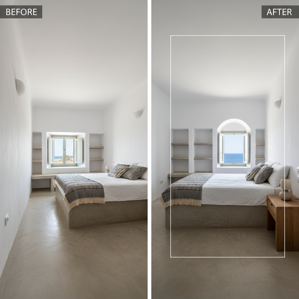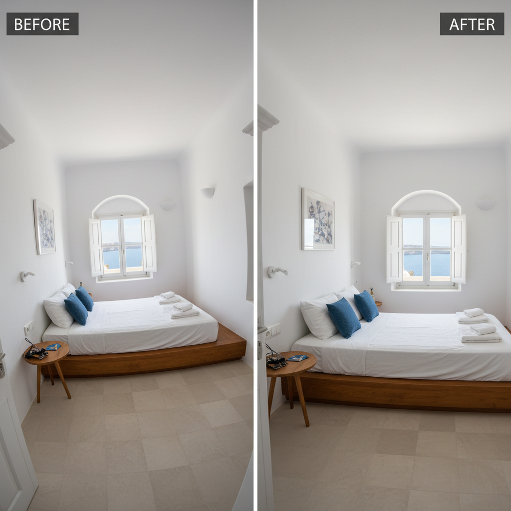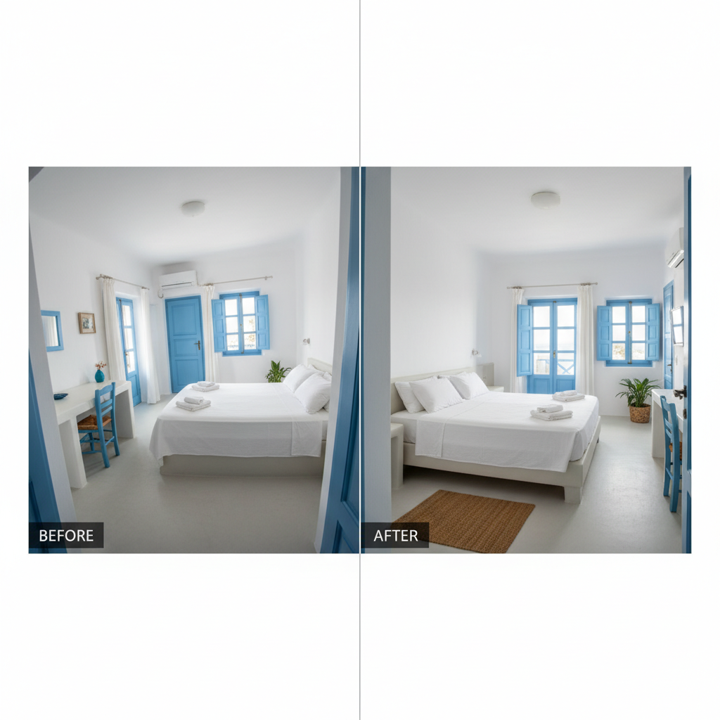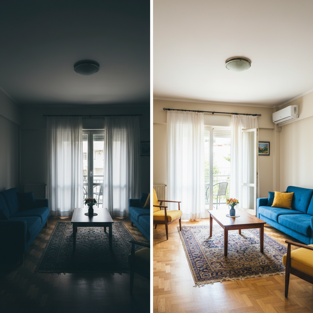Σκοτεινές Φωτογραφίες = Λιγότερες Κρατήσεις Το 67% των επισκεπτών στο Airbnb απορρίπτει listings με σκοτεινές ή underexposed εσωτερικές φωτογραφίες. Ένα modern loft στο Vouliagmeni με υπέροχο design μπορεί να φαίνεται μικρό και μη φιλόξενο απλώς λόγω κακής λήψης. Η ανάγκη για άμεσα, photorealistic before/after αποτελέσματα είναι πραγματική — και εδώ…