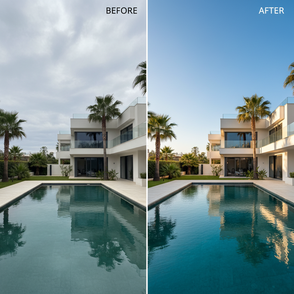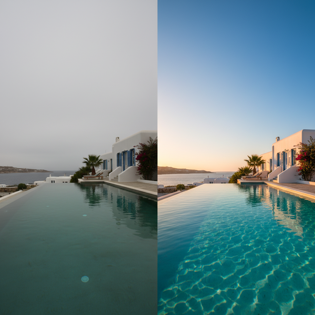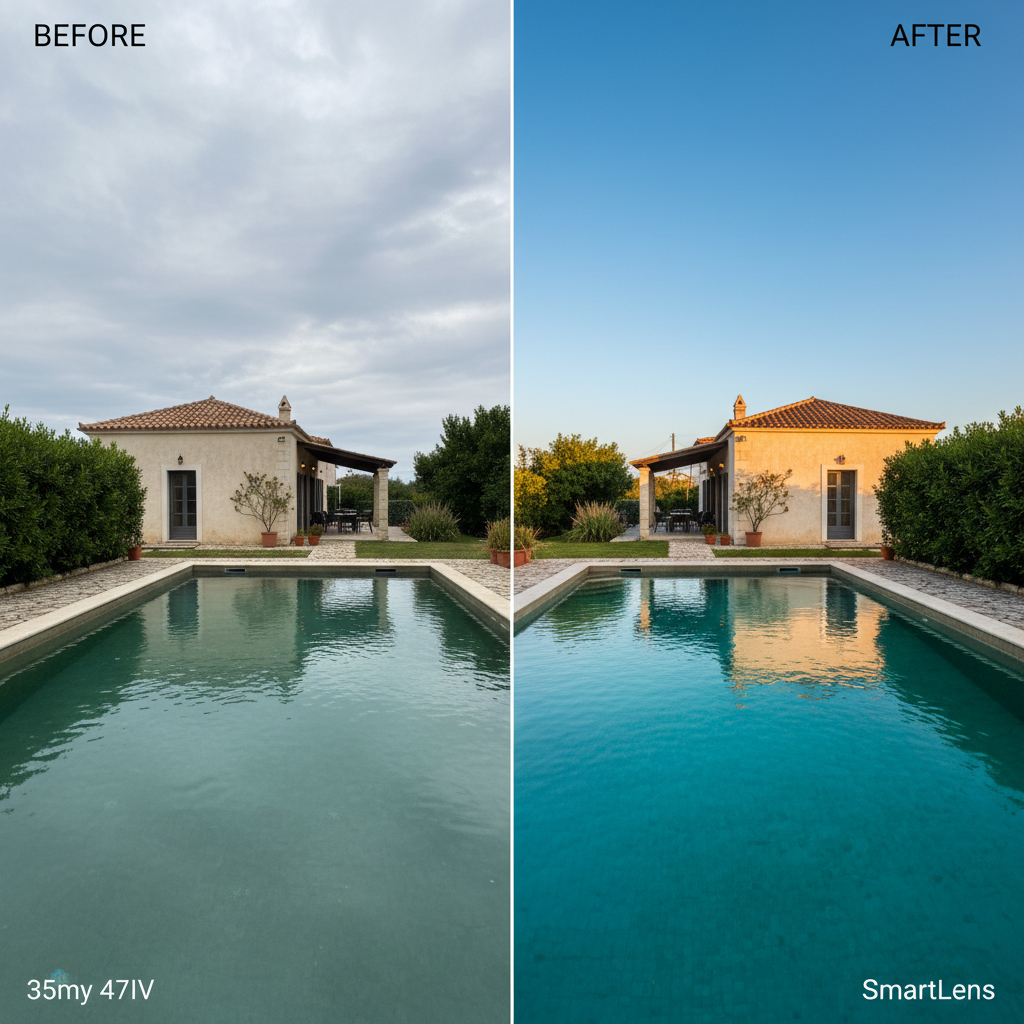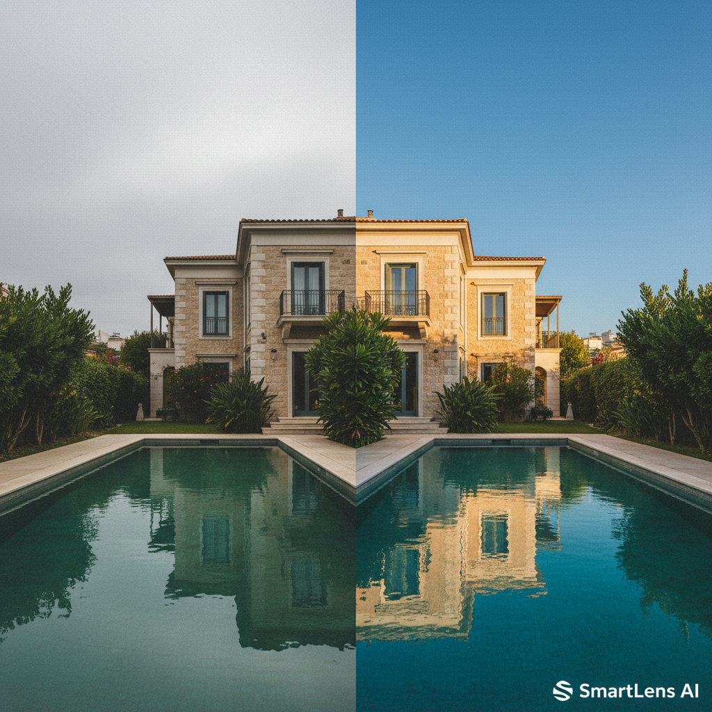 Γκρίζος Ουρανός Σκοτώνει το Outdoor Appeal Μια φωτογραφία εξωτερικού χώρου με συννεφιά μπορεί να μειώσει το ενδιαφέρον των επισκεπτών σε δευτερόλεπτα. Αν έχεις ένα island villa στην Κέρκυρα, η πρώτη εικόνα με την πισίνα και την βεράντα πρέπει να πουλάει το lifestyle — όχι την κακοκαιρία. Το SmartLens αντιμετωπίζει αυτό…