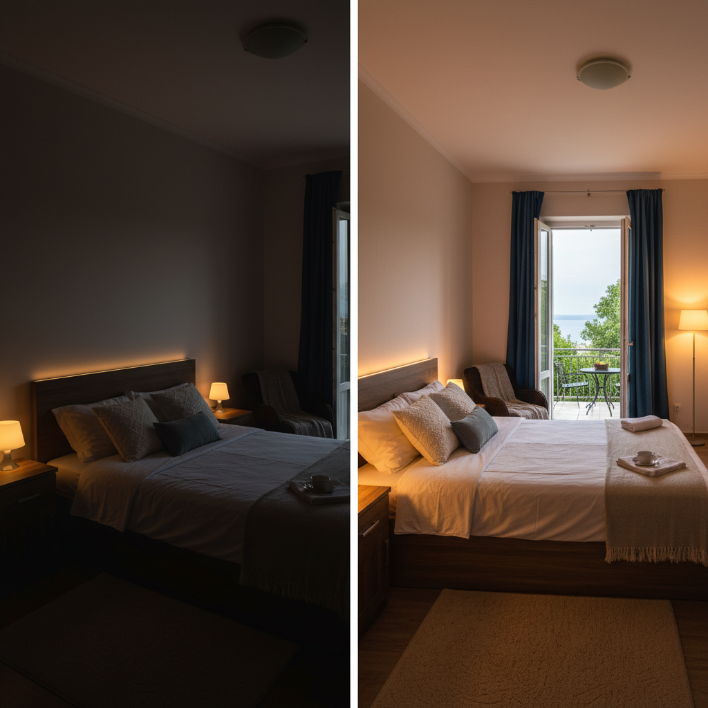 Σκοτεινό υπνοδωμάτιο = Χαμένες κρατήσεις για city apartment Ένα υπνοδωμάτιο που βγαίνει σκοτεινό στις φωτογραφίες συχνά δίνει την εντύπωση ότι το ακίνητο είναι μικρό, παλιό ή άβολο — και οι επισκέπτες προχωρούν στο επόμενο listing. Για hosts στη Rhodes, όπου ο ανταγωνισμός για city apartment είναι έντονος, αυτό μπορεί να…