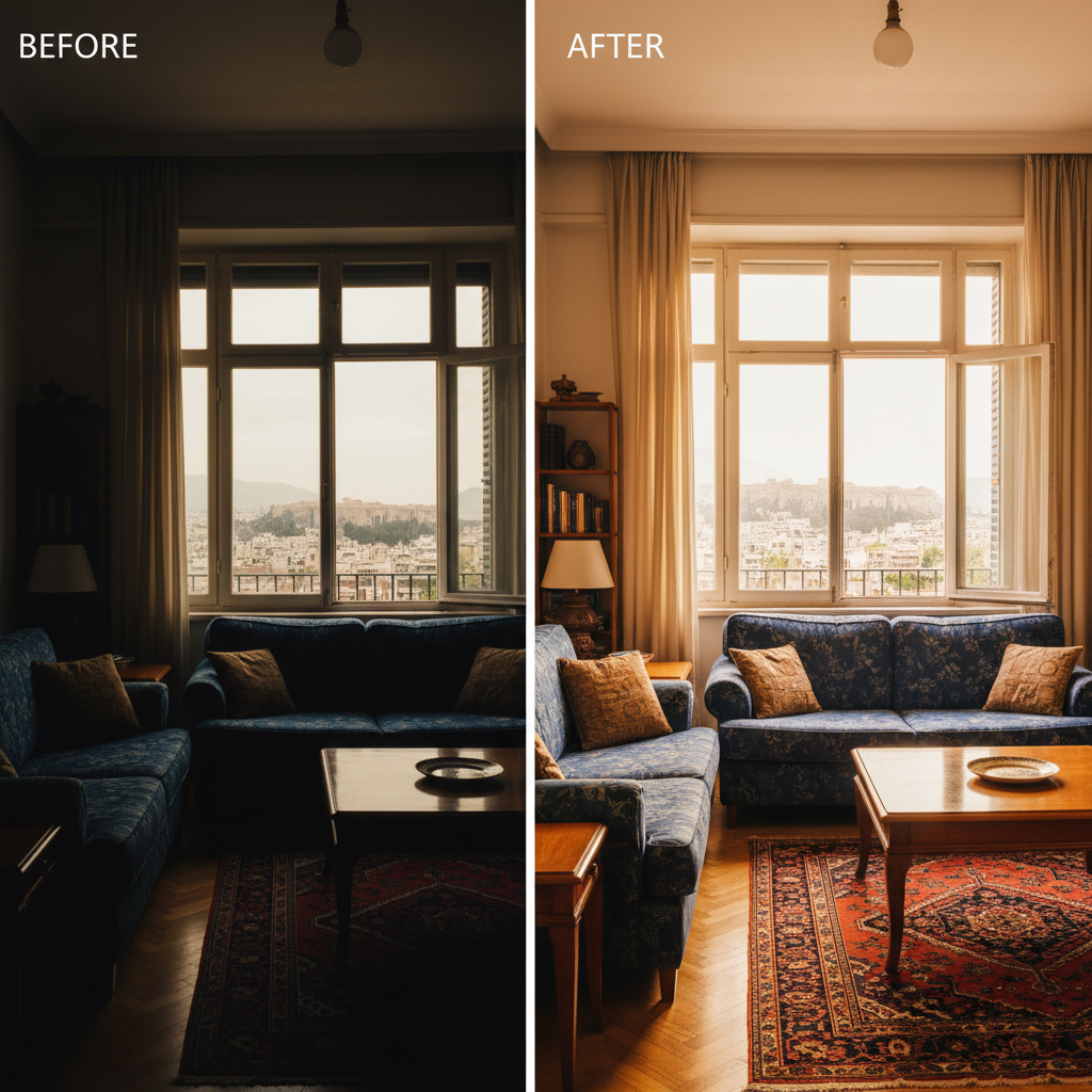 Σκοτεινό Σαλόνι → Φωτεινό Penthouse: AI Επεξεργασία Φωτογραφιών
