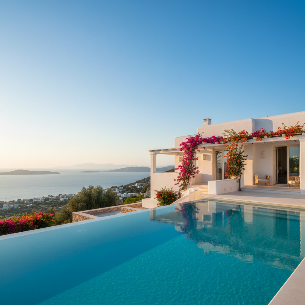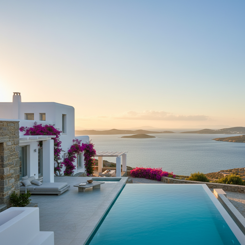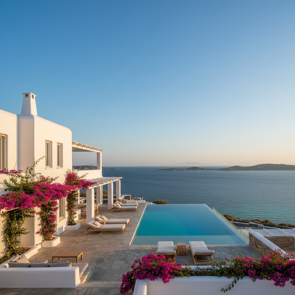 Apartment Mykonos: Φωτογραφίες με AI, Πολυτελές Εξωτερικό Μπλε Ουρανός